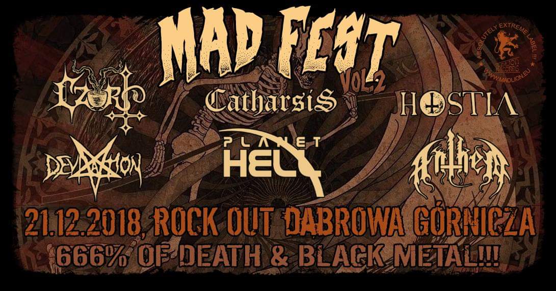 Są takie polskie miasta, które w zestawieniu z krajowym topem absurdalności, mogą uchodzić za oazy spokoju, swoiste mekki nudy i przewidywalności. Żyje się w nich całkiem wygodnie, mają sporo parków, w których odbywają się dni miasta, ale jakoś nie dochodzi w ich trakcie do ataków nożowników, gwałcicieli, a i bójki pijanych chuliganów to rzadkość. Praktycznie z niczego nie słyną, w konsekwencji w mediach po prostu nie istnieją. Najbardziej szaloną cechą Dąbrowy Górniczej jest to, że graniczy z Sosnowcem. Ale czy w takich miastach naprawdę nigdy nic się nie dzieje? Może to tylko pozory. W miniony piątek w dąbrowskim klubie RockOut (znajdującym się między stacją kontroli pojazdów a Lidlem), odbyła się bowiem druga edycja festiwalu metalowego obłędu pt. Mad Fest. Jak wypadła przedświąteczna celebracja najciemniejszych muzycznych mocy i ile kotów skonsumowano? Już spieszę z relacją prosto z miejsca rytuału.
