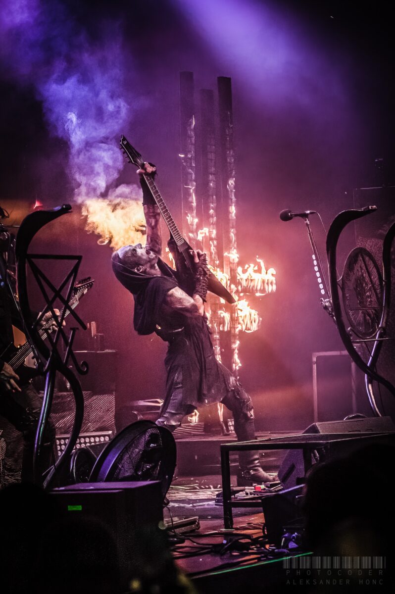 I na koniec przyszedł czas na headlinera. Behemoth stali się już swego rodzaju marką, na pewno pod względem profesjonalizmu. Nikt w Polsce nie może pochwalić się taką produkcją i takim rozpasaniem na scenie. Nikt z rodzimych kolegów muzyków nie może pochwalić się taką popularnością w świecie metalu i nie tylko. Panowie ciężko pracowali na ten status i zdecydowanie nie można im odmówić fantastycznego vibe’u, którym karmią swoją publikę od początku do końca każdej ze swoich sztuk. No właśnie, bez żenady koncerty Behemoth można nazywać sztukami – każdy detal, od przemyślanych strojów, makijażu, świateł, rekwizytów, po setlistę, jest dopracowany pod linijkę. Ja ten teatr za każdym razem kupuję i wchodzę w interakcję z przyjemnością i ciekawością. O to też tu chyba chodzi – przykuć uwagę trzeba umieć. Show rozpoczęło się za elegancką kotarą z logiem pobocznego projektu Adama Nergala Darskiego Me and That Man (swoją drogą niedługo ta machina rusza z drugim albumem, stay tuned, będzie ciekawie), która spektakularnie opadła z pierwszymi dźwiękami Wolves ov Siberia. Nergal jak zwykle dawał z siebie absolutnie wszystko i jeszcze trochę (może znów stałam za blisko sceny) i z miejsca wciągnął publikę w szał, na który wszyscy tego wieczoru byli właściwie gotowi. I tak, nie zabrakło ognia, a więc i płonącego krzyża, pary, confetti, latarki w wiadomym momencie i słynnego pióropusza. Bardziej szczegółowo – Panowie wciąż promują album I Loved You At Your Darkest, jednak nie zabrakło starszych dokonań wymieszanych w dobrych proporcjach, a więc pojawił się i wzniosły Ora Pro Nobis Lucifer, i chwytliwy (o ile to dobre słowo) o dziwo dla mnie wokalnie świetnie pociągnięty Bartzabel, i konkretny zjazd z wysokości z Conquer All czy Slaves Shall Serve, albo klasyk Chant For Eschaton 2000. Może mniej skupiałam się od momentu utworu Blow Your Trumpets Gabriel, ale za chwilę Chwała mordercom Wojciecha (997-1997 dziesięć wieków hańby), plus przygniatający Horns ov Baphomet zmył wszystkie wąty do cna. Koniec z bisami obejrzałam z końca sali koncertowej i równie mocno tkwiłam w tej sztuce do finału. Nie ma co się więcej rozwodzić – Sabbath Matter!