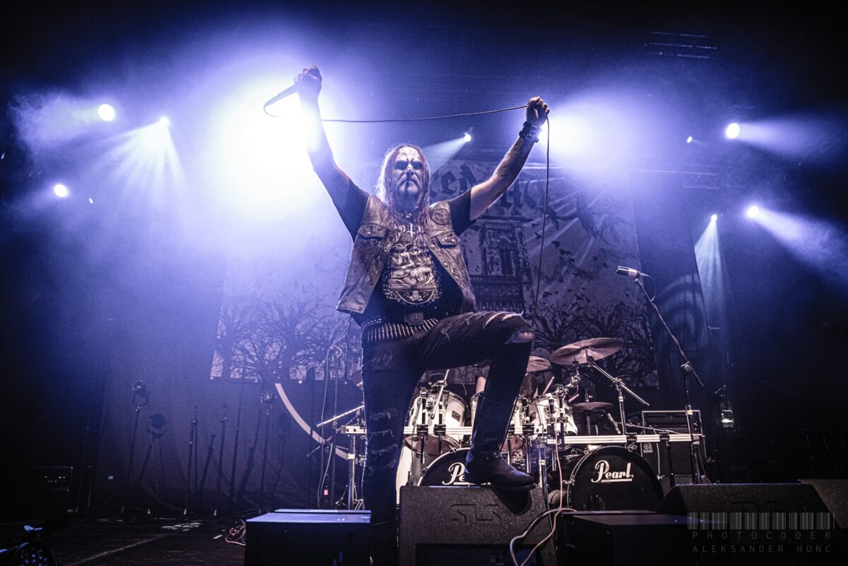 I na koniec przyszedł czas na headlinera. Behemoth stali się już swego rodzaju marką, na pewno pod względem profesjonalizmu. Nikt w Polsce nie może pochwalić się taką produkcją i takim rozpasaniem na scenie. Nikt z rodzimych kolegów muzyków nie może pochwalić się taką popularnością w świecie metalu i nie tylko. Panowie ciężko pracowali na ten status i zdecydowanie nie można im odmówić fantastycznego vibe’u, którym karmią swoją publikę od początku do końca każdej ze swoich sztuk. No właśnie, bez żenady koncerty Behemoth można nazywać sztukami – każdy detal, od przemyślanych strojów, makijażu, świateł, rekwizytów, po setlistę, jest dopracowany pod linijkę. Ja ten teatr za każdym razem kupuję i wchodzę w interakcję z przyjemnością i ciekawością. O to też tu chyba chodzi – przykuć uwagę trzeba umieć. Show rozpoczęło się za elegancką kotarą z logiem pobocznego projektu Adama Nergala Darskiego Me and That Man (swoją drogą niedługo ta machina rusza z drugim albumem, stay tuned, będzie ciekawie), która spektakularnie opadła z pierwszymi dźwiękami Wolves ov Siberia. Nergal jak zwykle dawał z siebie absolutnie wszystko i jeszcze trochę (może znów stałam za blisko sceny) i z miejsca wciągnął publikę w szał, na który wszyscy tego wieczoru byli właściwie gotowi. I tak, nie zabrakło ognia, a więc i płonącego krzyża, pary, confetti, latarki w wiadomym momencie i słynnego pióropusza. Bardziej szczegółowo – Panowie wciąż promują album I Loved You At Your Darkest, jednak nie zabrakło starszych dokonań wymieszanych w dobrych proporcjach, a więc pojawił się i wzniosły Ora Pro Nobis Lucifer, i chwytliwy (o ile to dobre słowo) o dziwo dla mnie wokalnie świetnie pociągnięty Bartzabel, i konkretny zjazd z wysokości z Conquer All czy Slaves Shall Serve, albo klasyk Chant For Eschaton 2000. Może mniej skupiałam się od momentu utworu Blow Your Trumpets Gabriel, ale za chwilę Chwała mordercom Wojciecha (997-1997 dziesięć wieków hańby), plus przygniatający Horns ov Baphomet zmył wszystkie wąty do cna. Koniec z bisami obejrzałam z końca sali koncertowej i równie mocno tkwiłam w tej sztuce do finału. Nie ma co się więcej rozwodzić – Sabbath Matter!