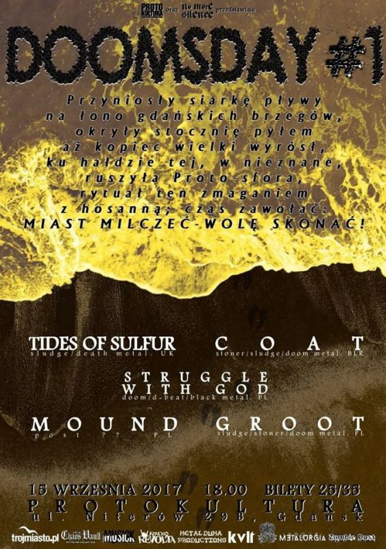 W przypadku kolosalnej obsuwy na omawianym koncercie nie da się wskazać konkretnego winnego, bo Tides of Sulfur po prostu utknęli w korkach po drodze, na dodatek spędzając 15 godzin w busie, a potem razem ze wszystkimi dzielnie czekali na swoją kolej na scenie w klubie, byli więc zapewne jeszcze bardziej padnięci niż ja. Mimo wszystko wkurw mnie trzymał – nie każdy, kto chce w piątkowy wieczór zobaczyć fajną kapelę, ma chęć i możliwość przesiedzieć w klubie całą noc. Za stary jestem na takie rzeczy. Cykliczny Doomsday zaczął jednak mimo wszystko obiecująco – od koncertu ciekawych kapel, na dodatek uwzględniając lokalnych wyjadaczy (Struggle With God), miejscowych dobrze rokujących młodzian (Mound) i okolicznych debiutantów (Groot). Klucz doboru zespołów był więc jak najbardziej dobry, a nagłośnienie po koncercie Groot już spisywało się jak trzeba. Publiczność, mam nadzieję, rozkręci się wraz z kolejnymi edycjami, warto zatem śledzić imprezę. Na Doomsday #2 pojawi się zaciąg ze wschodu niezwiązany z manewrami Zapad – białoruskie Woe Unto Me (funeral doom metal) i Nebulae Come Sweet (doom metal) oraz rosyjski Psilocybe Larvae (doom/death metal).