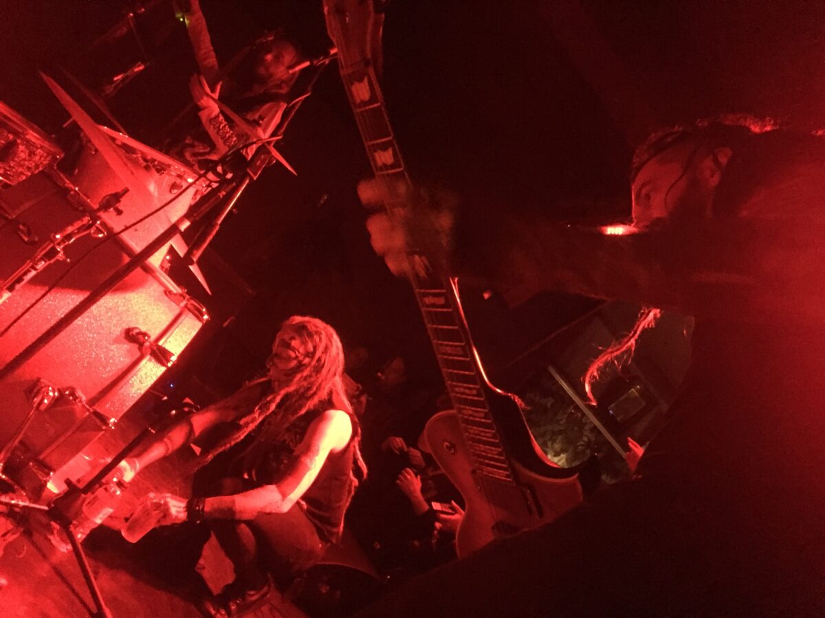 We didn’t have to wait long for Dopethrone, they needed maybe about ten minutes to set up the gear and to finish drinks. When they got on stage, the club was already full and there was really little space. I stood by the side right next to Vince’s amplifiers and it was a mistake. I will explain this at the end of the article. The sound of guitar feedbacks let us know that they are ready, Julie huddled at the drumkit awaiting the right moment to start breaking bones. From the first moments of Snort Dagger from the last album (Transcanadian Anger, 2018), fans went insane, and the band filled the whole place with the wild energy. I have to admit that through the first three tracks, it was not easy for me to get in the mood. Although I love Canadians’ music, the noise and intensity that the band creates live can be painful for listeners. I got used to it and fell into a trance somewhere in the middle of the gig, at the song Dark Foil. I have the impression that the longer the band played, the better it sounded, as if the reception of their music was improving in the head, and the selectivity replaced the noise. With the biggest hit Scum Fuck Blues sung along with the fans, the band went completely crazy, it was a real sludge madness, ended with the stage-diving of one of the fans, as well as the fall of Vince, who continued the slaughter sitting down. Dopethrone finished the work by the song Killdozer and it was a “final touch”, crowned with the destruction of the Shawn’s drumkit.