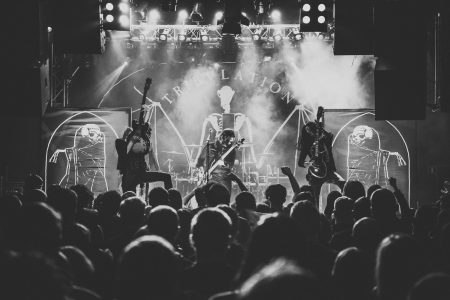 Na scenie pojawili się z ukrycia. Pierwszy wyłonił się perkusista Oscar Leander, którego wymalowane w trupich kolorach lico przypominało twarz topielca. Klimatyczne intro puszczon