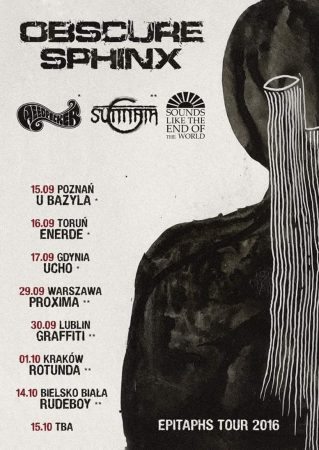 Fanom ciężkiego grania w iście czarnym, mrocznym wydaniu Obscure Sphinx nie trzeba przedstawiać. I nie mam na myśli tylko polskich fanów, jak się okazuje do warszawskiej Proximy 29 września br. na pierwszy koncert Sfinksów po dość długiej przerwie zawitało sporo gości spoza stolicy (tym bardziej, że w związku z problemami zdrowotnymi perkusisty koncert stał pod znakiem zapytania). Nic dziwnego, wydany we wrześniu tego roku trzeci album Epithaps (recenzja) cieszy się nie małym zainteresowaniem, toteż byłam ciekawa, czy trasa promująca przyciągnie masy. Otóż, jeszcze nie teraz, ale z czystym sumieniem życzę warszawskiej formacji headlinerskich, poważnych tras, bo poziom wykonania i prowadzenia koncertu, jaki zaprezentowali, to nie tyle profesjonalizm – to był majstersztyk.