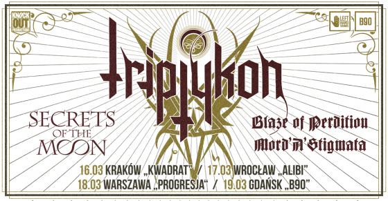 Agencja koncertowa Knock Out Productions zaprasza na marcowe koncerty zespołu Triptykon w Polsce. Jako supporty na scenie wystąpią Blaze Of Perdition oraz Mord’a’Stigmata oraz fenomenalny Secrets Of The Moon. Poniżej plan trasy koncertowej: