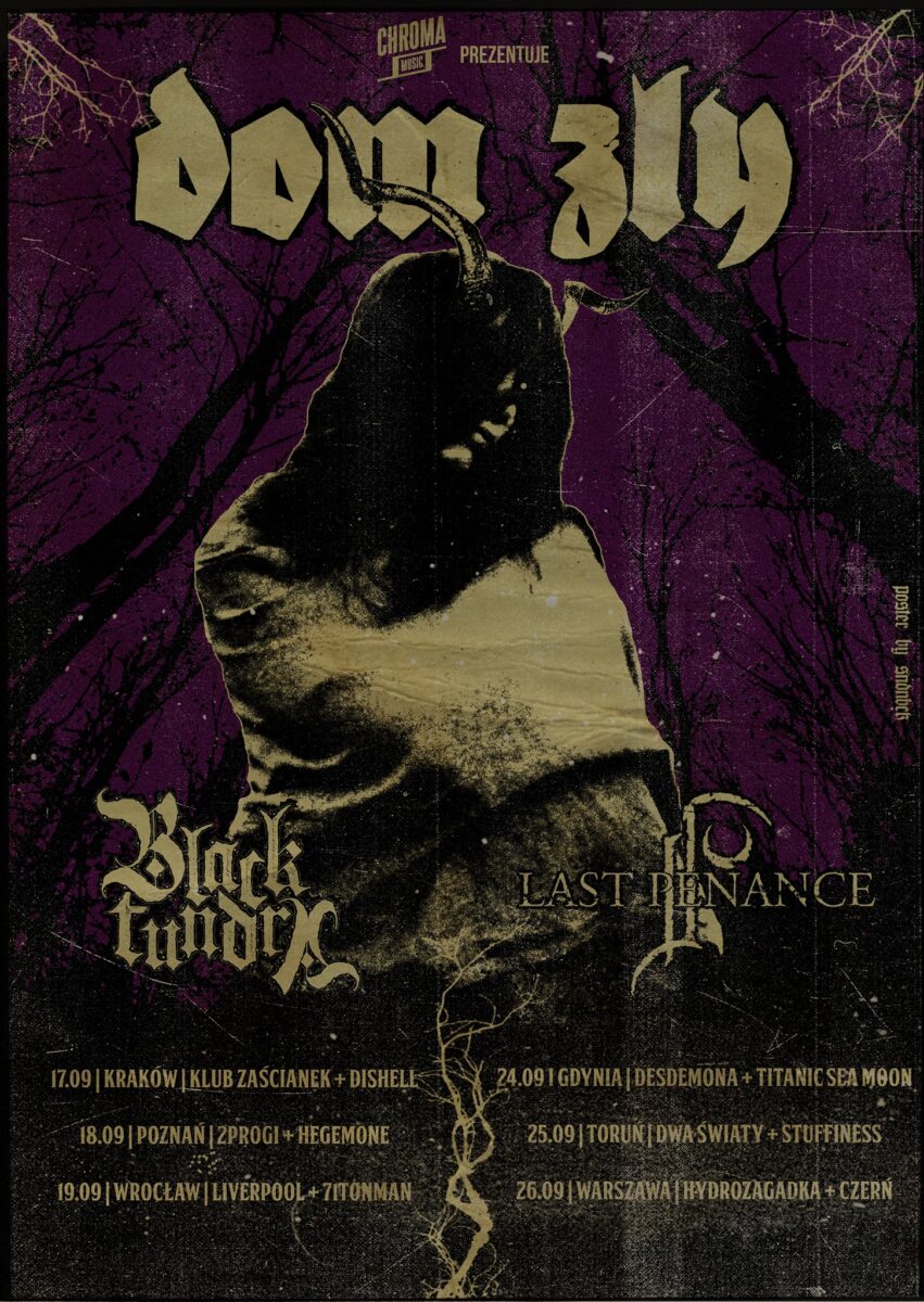 Organizator Chroma Music zaprasza na trasę koncertową zespołu Dom Zły promującą ich najnowsze wydawnictwo Śnisz bory tak gęste. Jak możemy wyczytać z plakatu wydarzenia formację zasilą takie bandy jak Black Tudra i Last Penance. Trasa składa się z sześciu miast, które przedstawiamy poniżej wraz z zespołami, które dodatkowo wesprą ekipy. Plakat autorstwa SNDNBCK.