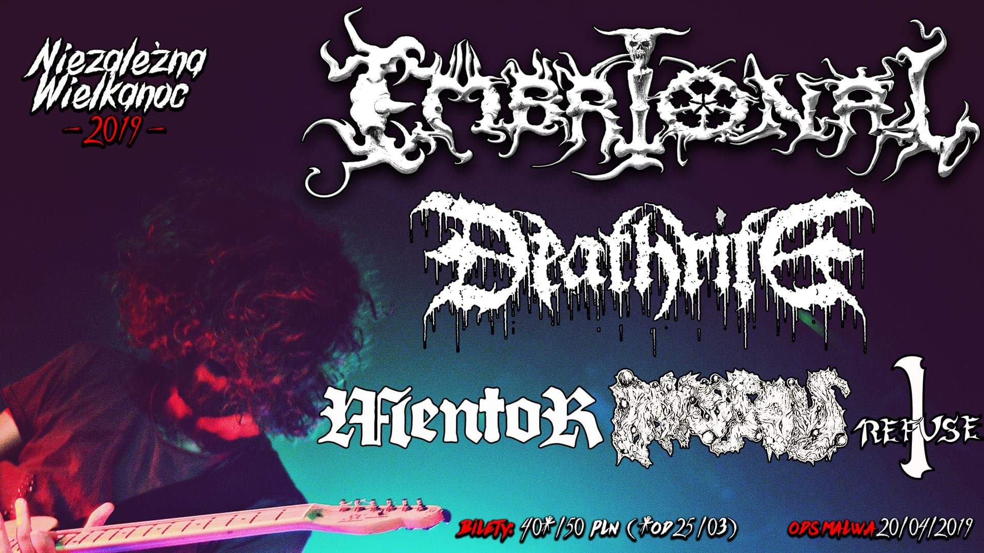 Tagi: Abyssous, bilety, Deathrite, Embrional, I Refuse, Malwa, Mentor, Niezależna Wielkanoc 2019, Ostrowiec Świętokrzyski, Ostrowiecka Scena Alternatywna, White Raven Events.