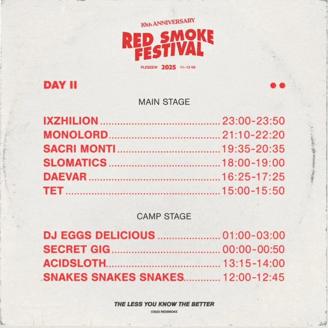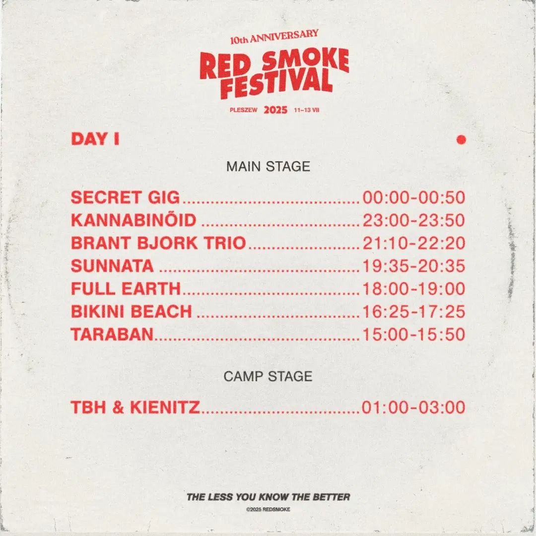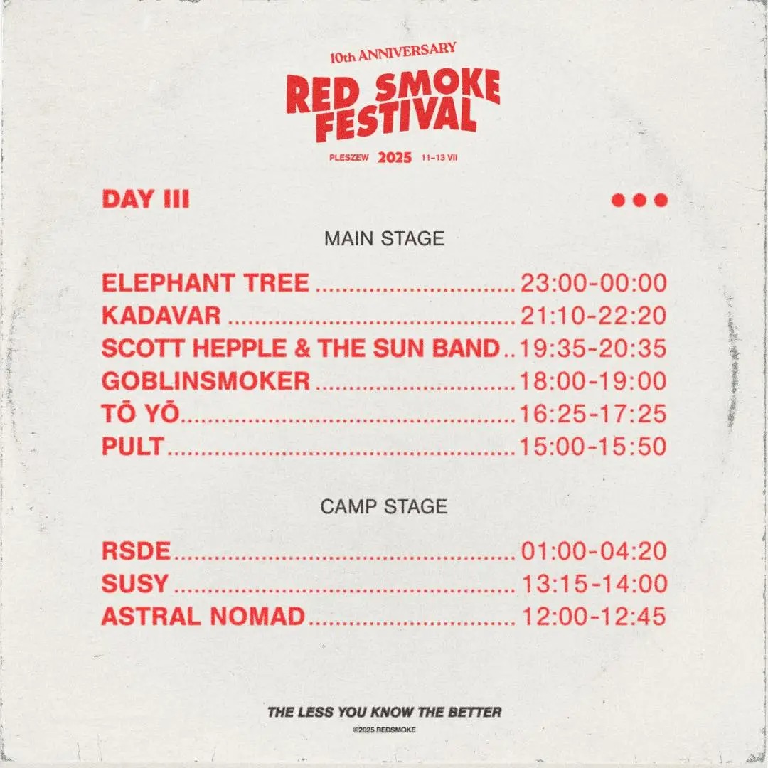 Tagi: 2025, Acidsloth, Astral Nomad, Bikini Beach, Brant Bjork Trio, Daevar, Dj Eggs Delicious, Elephant Tree, Full Earth, Goblinsmoker, Ixzhilion, Kadavar, Kannabinõid, lipiec, Monolord, Pleszew, Pult, Red Smoke Festival 2025, RSDE, Sacri Monti, Scott Hepple & The Sun Band, Secret Gig, Slomatics, Snakes Snakes Snakes, Sunnata, Susy, Taraban, TBH & Kienitz, Tet, Tō Yō.