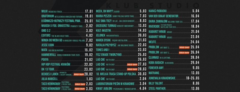Małgorzata Frankowska, dyrektorka programowa Klubu Studio: „Ja jak mantrę co kilka miesięcy powtarzam, że zbliżający się sezon będzie różnorodny, intensywny i wyjątkowy. Bo tak to już w naszym klubie jest i to jest jedna z jego najmocniejszych stron. Na wiosnę 2020 mamy przygotowany program zawierający praktycznie wszystkie gatunki muzyczne: będzie imieninowy koncert Grzegorza Turnaua, ale też Riverside czy Jelonek. Zupełnie wyjątkowo, bo po raz ostatni spotkamy się koncertowo z zespołem Lao Che (który złamał mi swoją decyzją serce) i to w czterech odsłonach na trasie „No to Che!”. W wyjątkowych projektach świętujący 30-lecie zespół Raz Dwa Trzy, po wielu latach nieobecności Maria Peszek oraz koncerty takich artystów, jak Editors, Kult w akustycznej odsłonie czy Van Der Graaf Generator. Oczywiście to nie wszystko. Zachęcam do śledzenia naszej strony i profilu na FB. Tym bardziej, że bywamy z artystami spontaniczni i nasz repertuar stale się uzupełnia.”