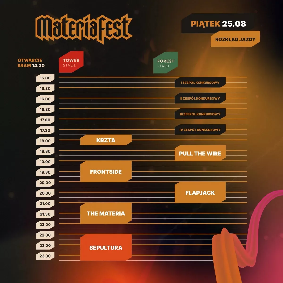 Jutro, czyli 25.08.2023 rozpocznie się dwudniowy open air festiwal pod marką Materiafest XI. Koncerty odbędą się przy Wieży Bismarcka w Szczecinku. Obok wielu znanych zespołów będą miały okazję zaprezentować się kapele wyłonione w konkursie, a po koncertach czas umilą Dj’e. Poniżej możecie znaleźć pełen skład wykonawców wraz z rozpiską godzinową.