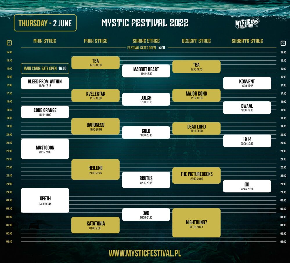 Tagi: (0), (DOLCH), 1914, Arabrot, Azarath, Baest, Baroness, Benediction, Bleed From Within, brutus, Carcass, Code Orange, Czerń, Dead Lord, decapitated, Deluge, Dopelord, Dwaal, Favorit89, festiwal, Fleshworld, Gaerea, gdańsk, GOLD, Green Lung, Grift, Hangman’s Chair, Heathen, Heilung, Igorrr, Imperial Triumphant, judas priest, Katatonia, killing joke, Konvent, kvelertak, LIK, Lindy-Fay Hella & Dei Farne, Maggot Heart, Major Kong, Mastodon, Mayhem, Medico Peste, Mercyful Fate, mgła, Mortiis, Motanka, Mystic Festival, Mystic Festival 2022, Neon Haze (Octopussy + Favorit89 + Nightrun87), Nightrun87, Okkultokrati, Only Sons, opeth, Ovo, Proscription, Raging Speedhorn, Red Scalp, Rosk, Saxon, Skeletal Remains, Sólstafir, Spaceslug, Spectral Wound, Svalbard, Taraban, Tester gier, The Materia, The Picturebooks, The Raven Age, The Stubs, The Vintage Caravan, Tom Warrior's Legacy, Tribulation, Truchło Strzygi, Urne, Vader, Wiegedood, Witchcraft.