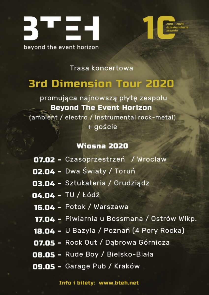 Poznański zespół Beyond The Event Horizon, grający od 10 lat lat instrumentalnego rocka okraszonego elektroniką, po ciepło przyjętej płycie Event Horizon z 2014 roku oraz EP-ce Far z 2017, szykuję kolejne wydawnictwo – płytę długogrającą o tytule Leaving The 3rd Dimension, której premiera szykowana jest na marzec 2020. Poniżej prezentujemy okładkę tego wydawnictwa.