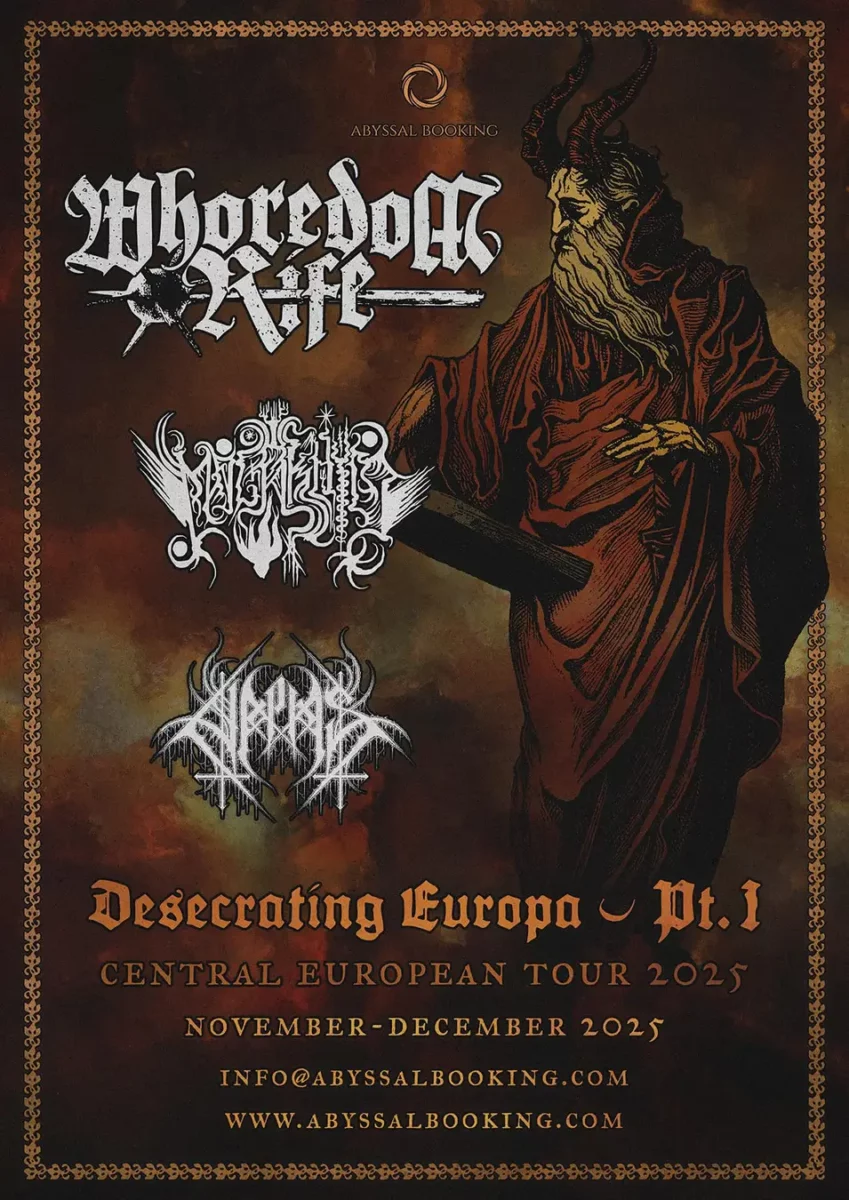 Abyssal Booking Agency zapowiada trasę koncertową zespołu Whoredom Rife. Trasa Desecrating Europa Tour Pt.1 odbędzie się na przełomie listopada i grudnia 2025 roku. Obok grupy zagrają Malakhim oraz Halphas. Na koncertach Whoredom Rife będzie promować album Den Vrede Makt, który ukazał się 31 maja. Płyta została wydana nakładem Terratur Possessions. Wkrótce więcej informacji.