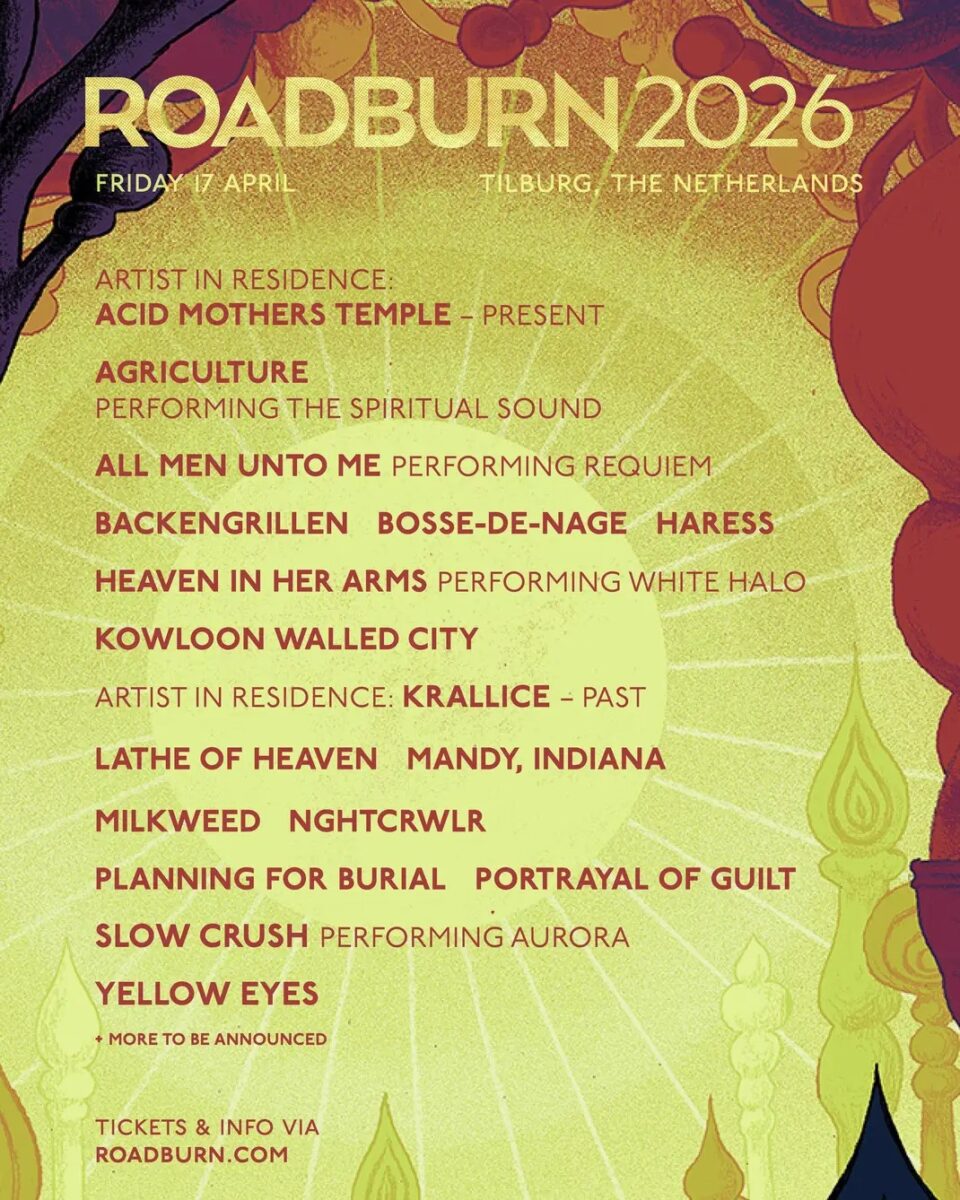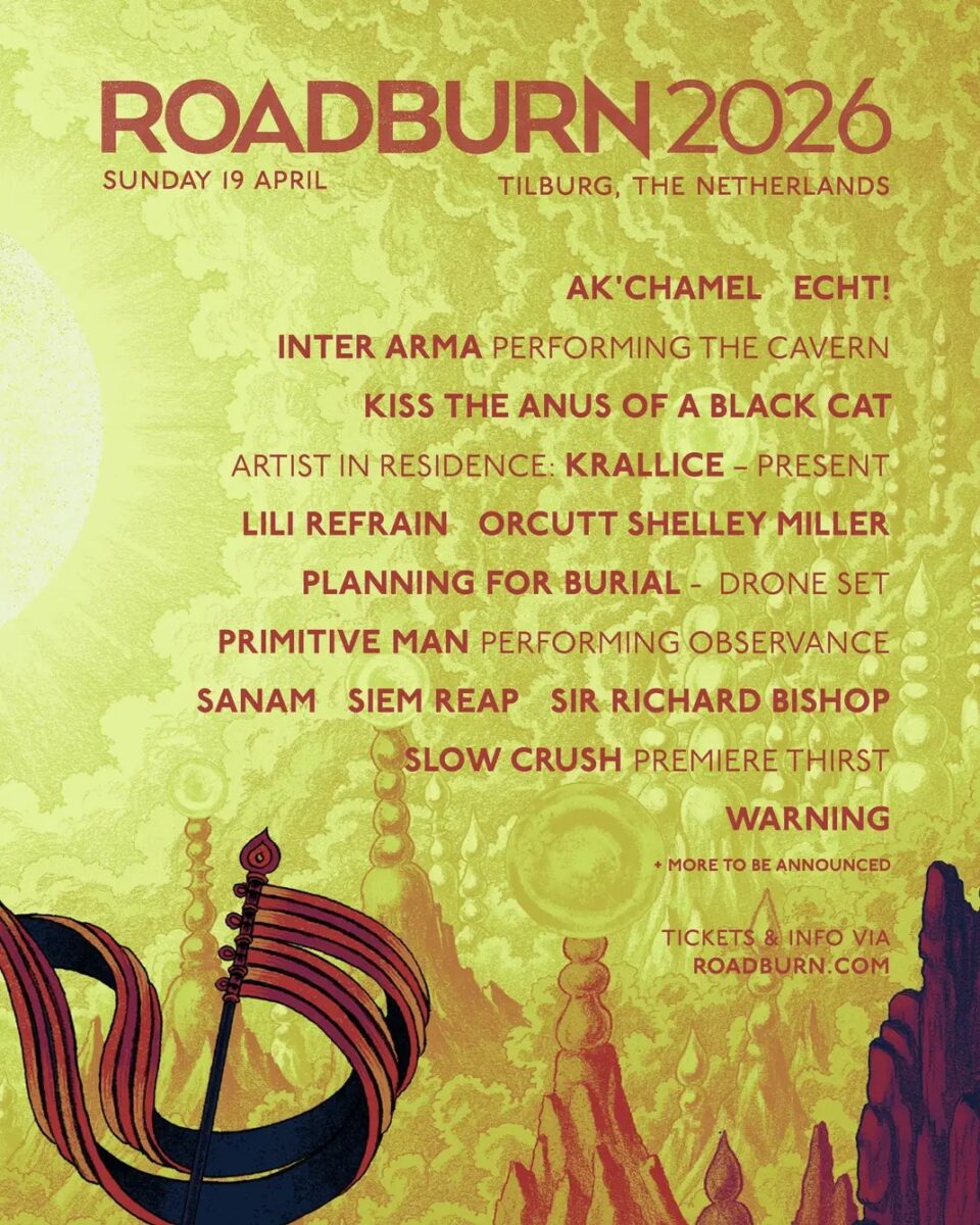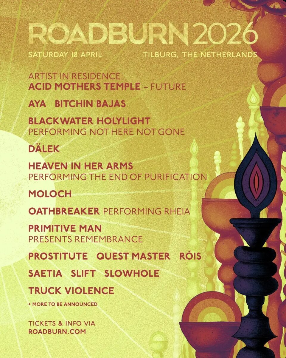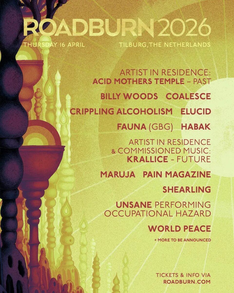 Tagi: Acid Mothers Temple, Agriculture, Ak'Chamel, All Men Unto Me, Aya, Backengrillen, Billy Woods, Bitchin Bajas, Blackwater Holylight, Bosse-De-Nage, Coalesce, Cripping Alcoholism, Dälek, Echt!, Elucid, Fauna, Habak, Haress, Heaven In Her Arms, Indiana, Inter Arma, Kiss The Anus Of A Black Cat, Kowloon Walled City, Krallice, Lathe Of Heaven, Lili Refrain, Mandy, Maruja, Milkweed, Moloch, Nghtcrwlr, Oathbreaker, Pain Magazine, Planing For Burial, Portrayal Of Guilt, Primitive Man, Prostitute, Quest Master, Roadburn 2026, Róis, Saetia, Sanam, Shearling, Siem Reap, Sir Richard Bishop, Slift, Slow Crush, Slowhole, True Violence, Unsane, Warning, World Peace, Yellow Eyes.