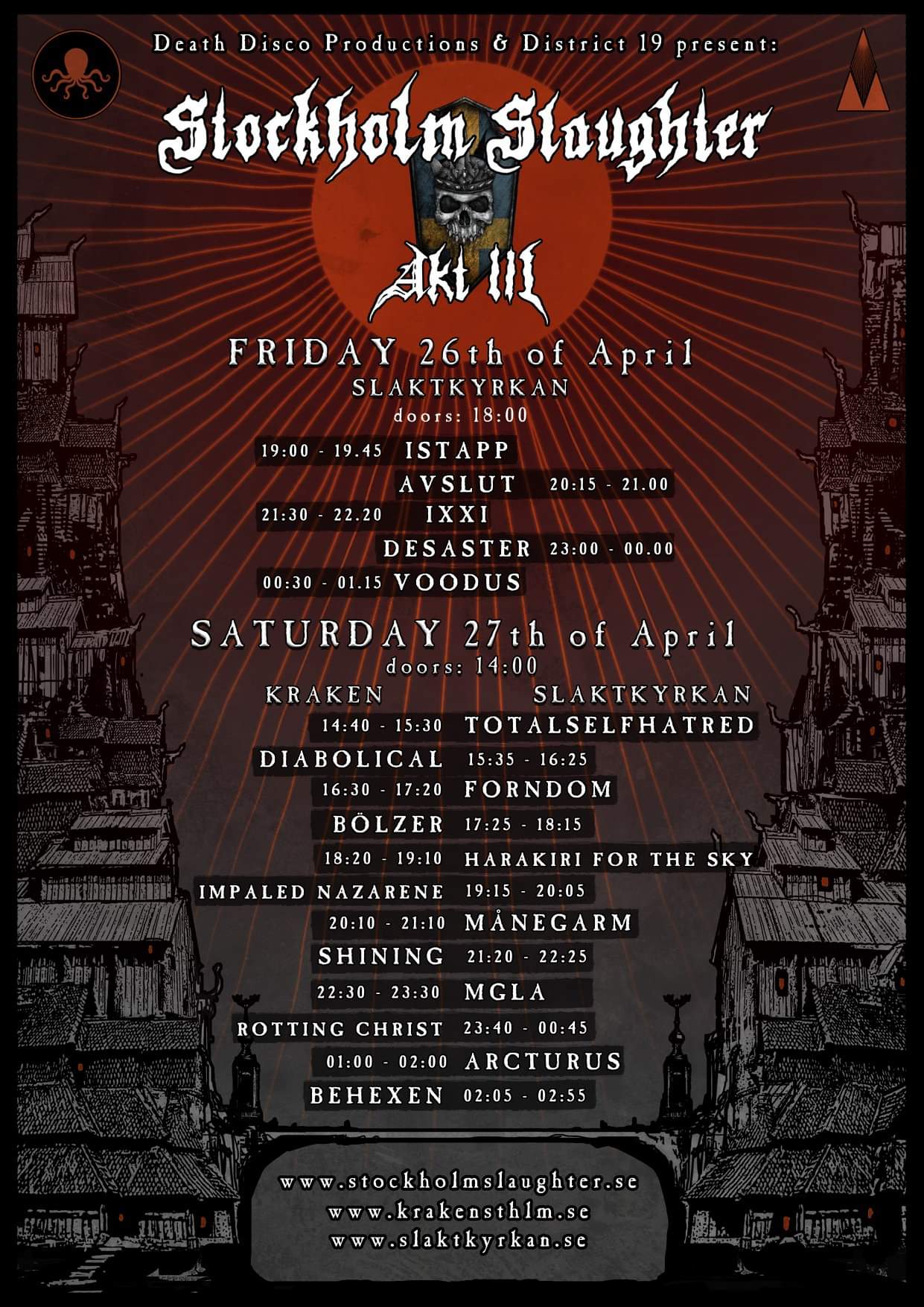 Tagi: Arcturus, Avslut, Behexen, Bölzer, Desaster, Diabolical, festiwal, Forndom, Harakiri For The Sky, Impaled Nazarene, Istapp, IXXI, Månegarm, mgła, plakat, Rotting Christ, rozpiska godzinowa, Shining, Stockholm Slaughter 2019, Totalselfhatred, Voodus.