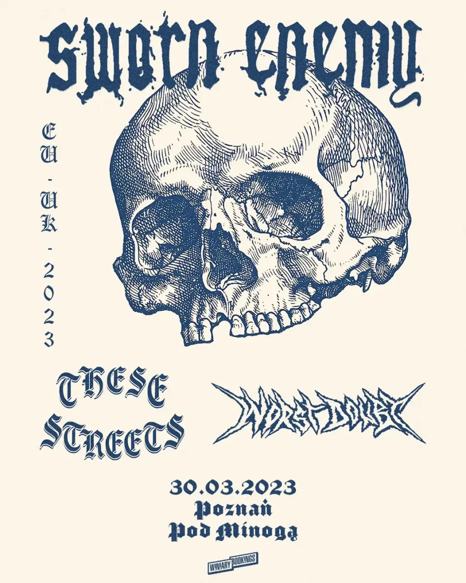 Sworn Enemy na scenie działają już 25 lat, a przez ten czas udało im się nagrać 8 albumów studyjnych. Ich dyskografię zamyka “Gamechanger” z 2019 roku. Zaczynali jako zespół Downfall, zmieniając później nazwę na Mindset i pod tym szyldem wkroczyli mocno na scenę NYHC w latach 90-tych. W 2001 roku wydali pierwszy krążek, już jako Sworn Enemy. Był to album “Negative Outlook”, wypuszczony przez wytwórnię Stillborn Records należącą do Jamey Jasty z Hatebreed. Przez lata dużo eksperymentowali ze stylem, wciąż krążąc wokół sceny hardcore i klasycznego metalcore’u. Dziś wielu definiuje zespół jako przedstawicieli crossover thrash metalu. To będzie wieczór mocnej i bezkompromisowej muzyki, a otworzą go francuski Worst Doubt, który wciąż promuje swój ostatni album “Extinction” z 2021 roku, a także kalifornijskie These Streets, czyli projekt Camerona Grabowskiego, byłego gitarzysty Lionheart. Jeśli lubicie klasyczny metalcore i zmetalizowane, hardcore’owe riffy z jasnym przekazem na wokalu, to nie możecie ominąć tego koncertu!