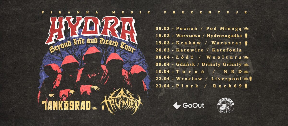 Koncert w ramach trasy promującej nowy album pleszewskiego zespołu Hydra! Po wydaniu Beyond Life And Death doom metalowa bestia wyruszy w kraj, by zagrać kilka koncertów. Na trasie towarzyszyć im będą fenomenalni goście, m.in. Tankograd i Las Trumien. Druga część trasy obejmie następujące miasta: