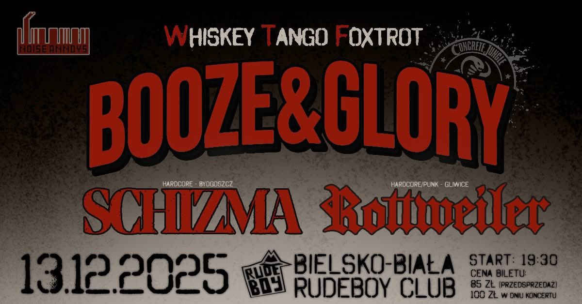Już w najbliższy weekend hardcore’owa Schizma oraz Noise Annoys Booking Agency zapraszają na trzy koncerty. Eventy te mają promować nowe dzieło Booze & Glory noszące tytuł Whiskey Tango Foxtrot. U boku scenowych wyjadaczy zaprezentują się Rottweiler (Bielsko-Biała) i Lazy Class (Warszawa).