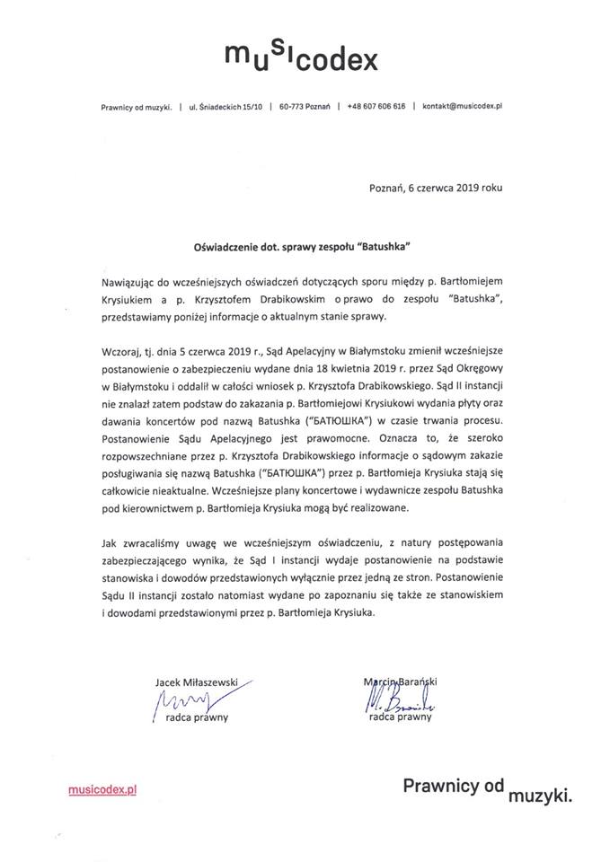 W kwietniu gitarzysta opublikował w sieci postanowienie Sądu Okręgowego w Białymstoku.
